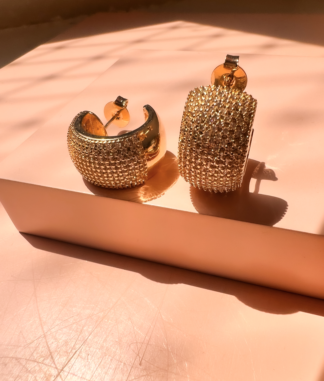 Argola Bojuda Cravejada com micro zircônias, confeccionado em Banho de Ouro Amarelo.