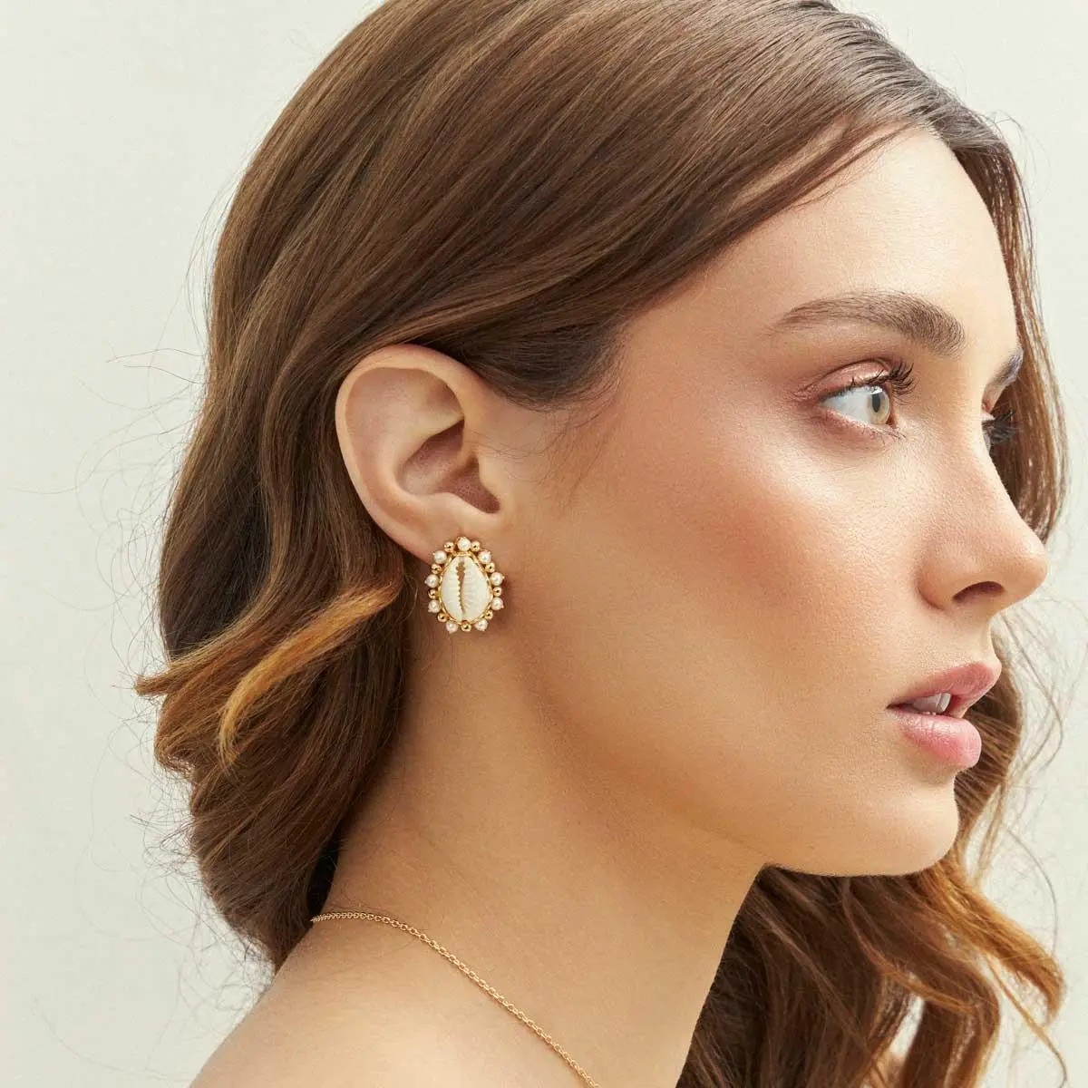 Brinco Búzios Pérolas e Balls, confeccionado em Banho de Ouro Amarelo.