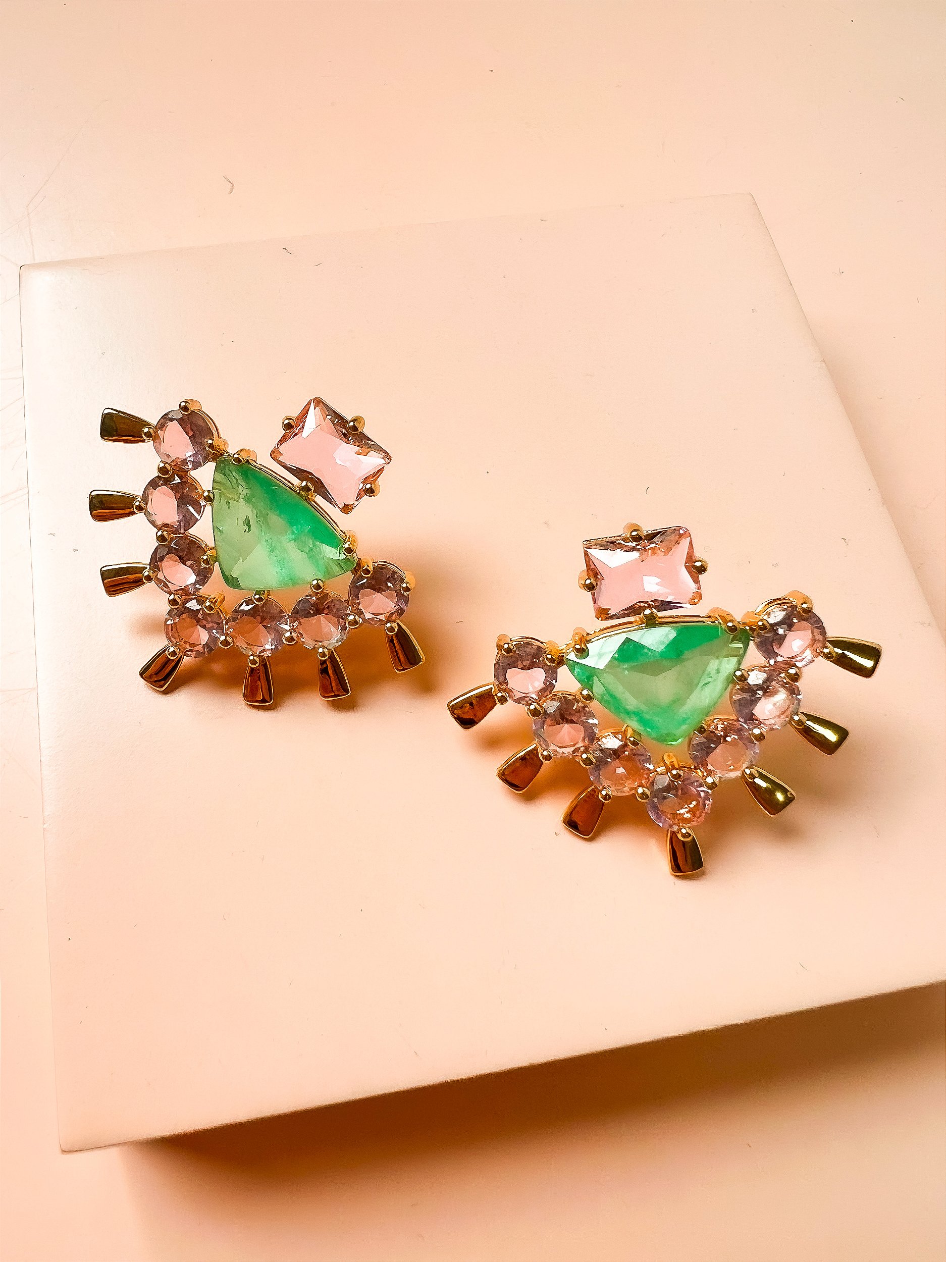 Brinco Leque Triangular com zircônias Pedra Verde e Rosa, confeccionado em Banho de Ouro Amarelo.