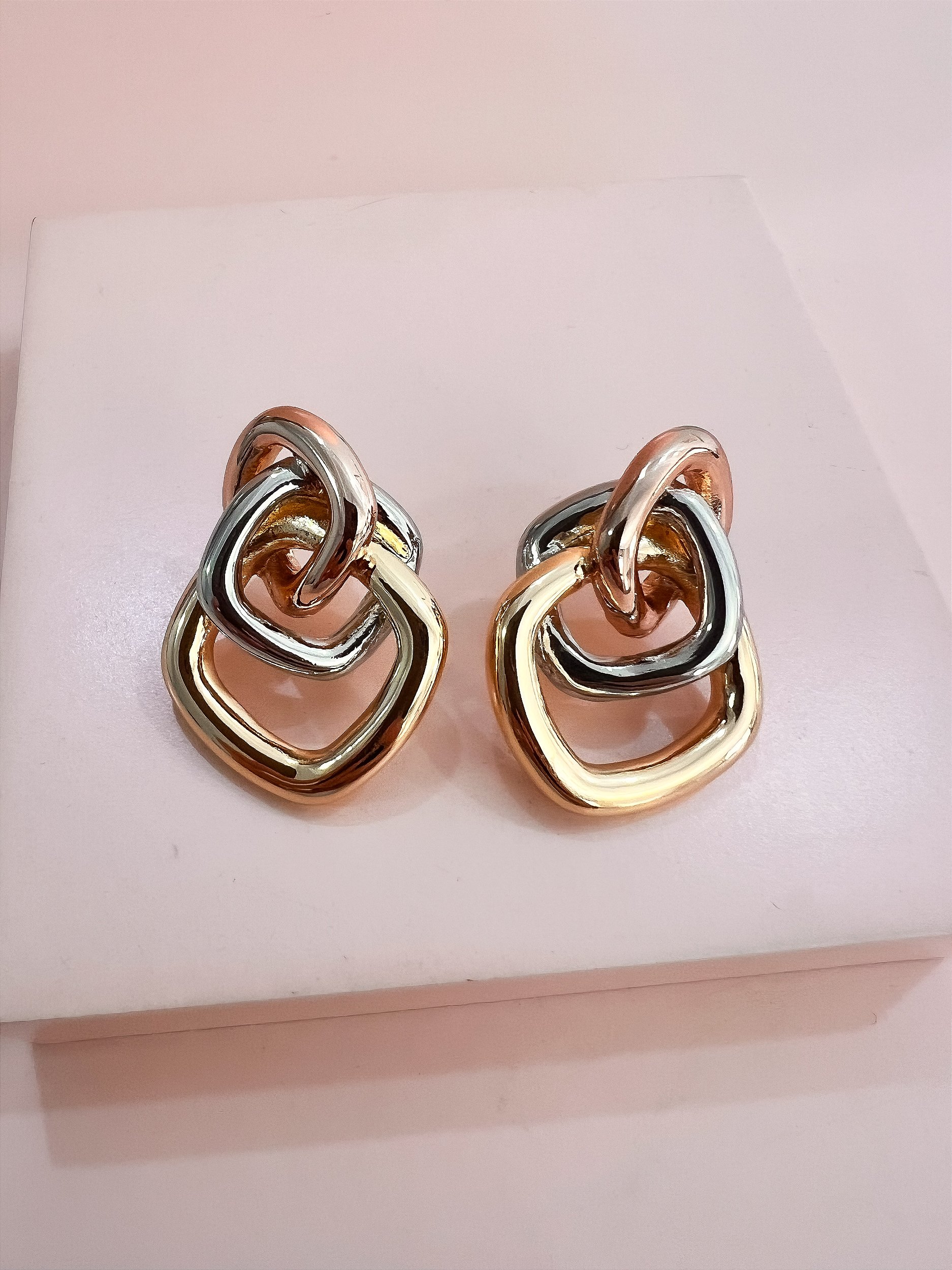 Brinco Losangos Entrelaçados Mix de Banhos, confecciondo em Banho Ouro, Rosê e Ródio Branco.