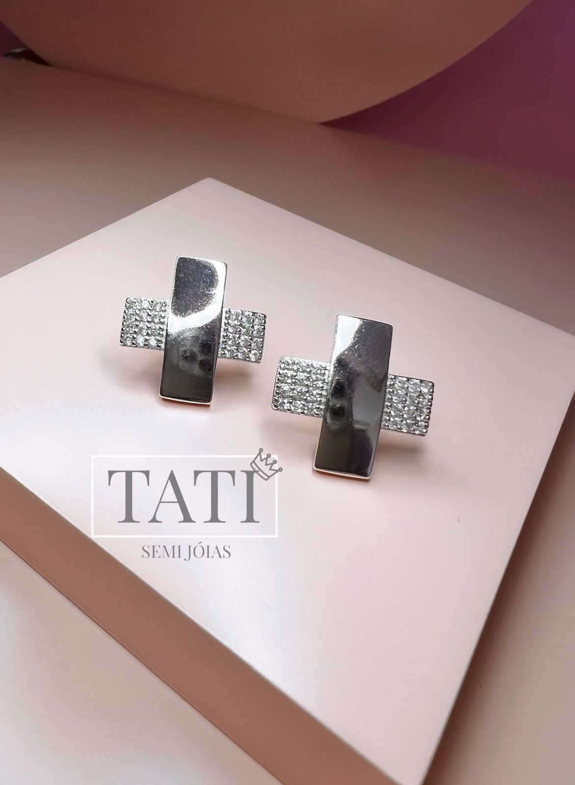 Brinco X Liso e Micro Zircônia Confeccionado em Banho de Ródio Branco.