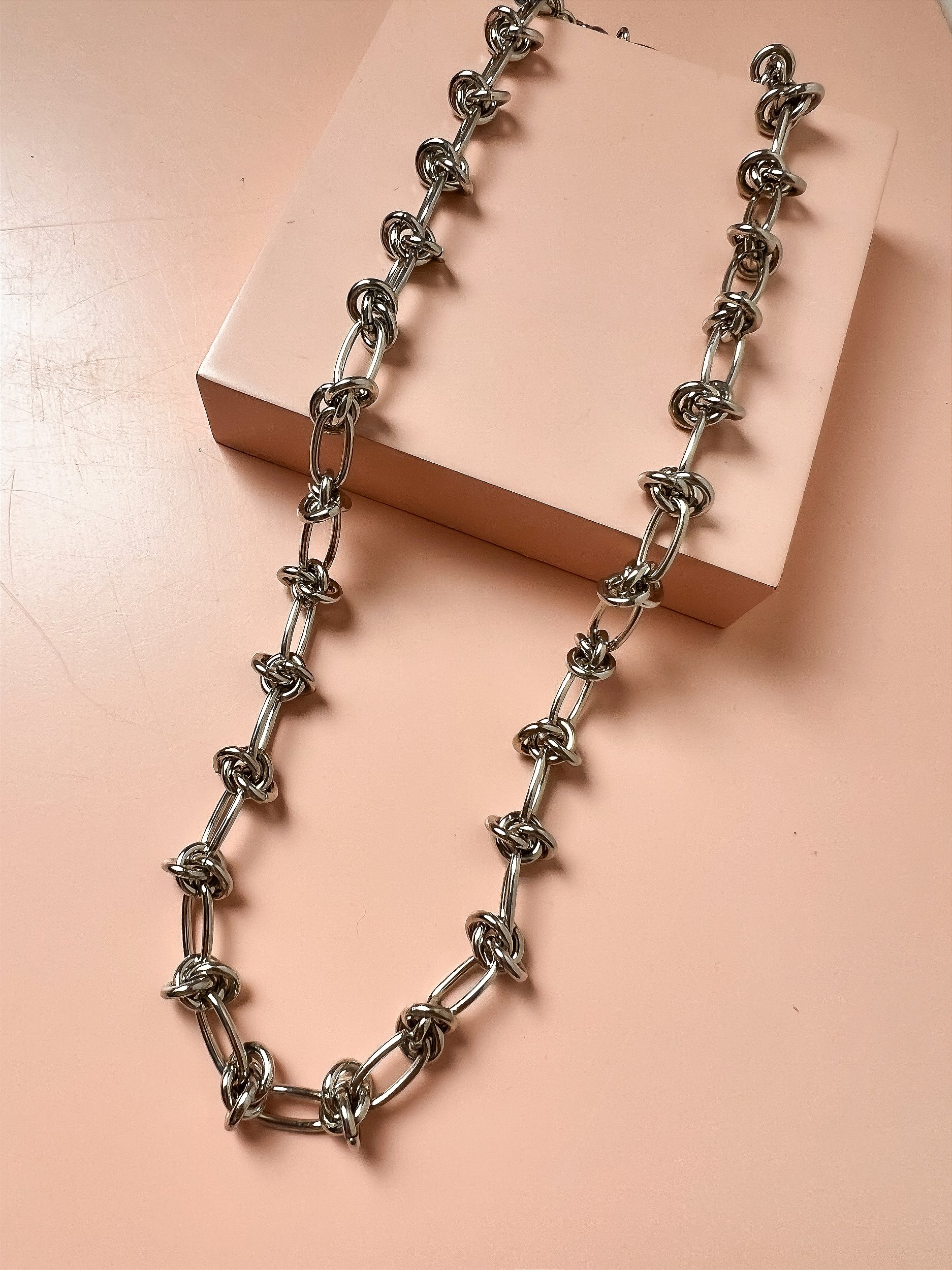 Colar Correntaria Elos e Nó, confeccionado em Banho de Ródio Branco.