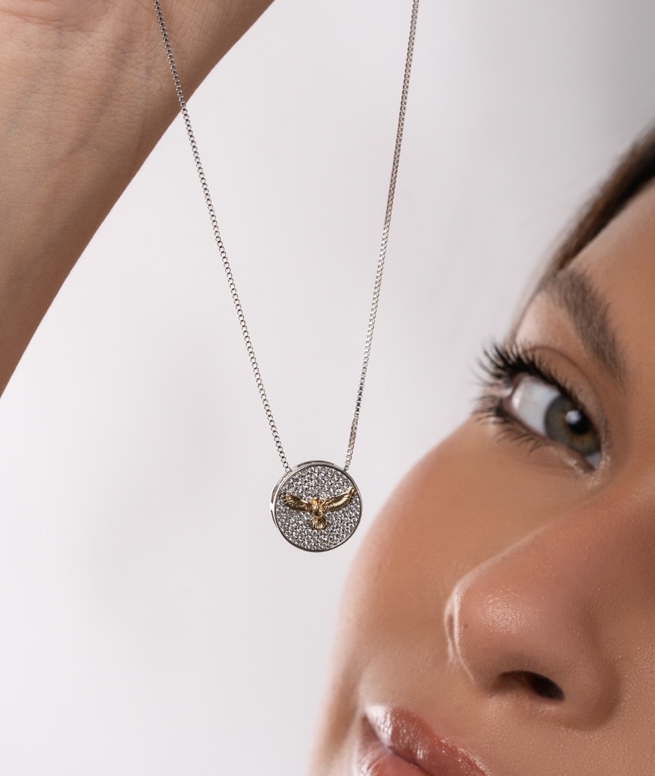 Colar Espírito Santo Cravejado, confeccionado em Banho de Ouro e Ródio Branco .