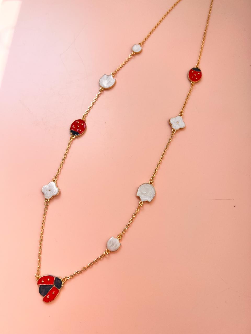 Colar Longo Inspiração Joaninha, Trevo e Tulipa, confeccionado em Banho de Ouro Amarelo.