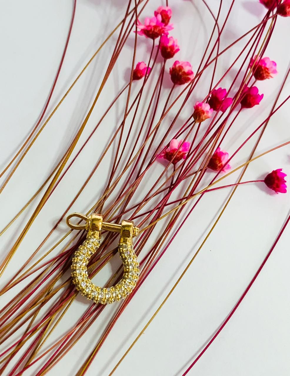 Pingente Fecho Manilha Cravejado Confeccionado em Banho de Ouro Amarelo 18K.
