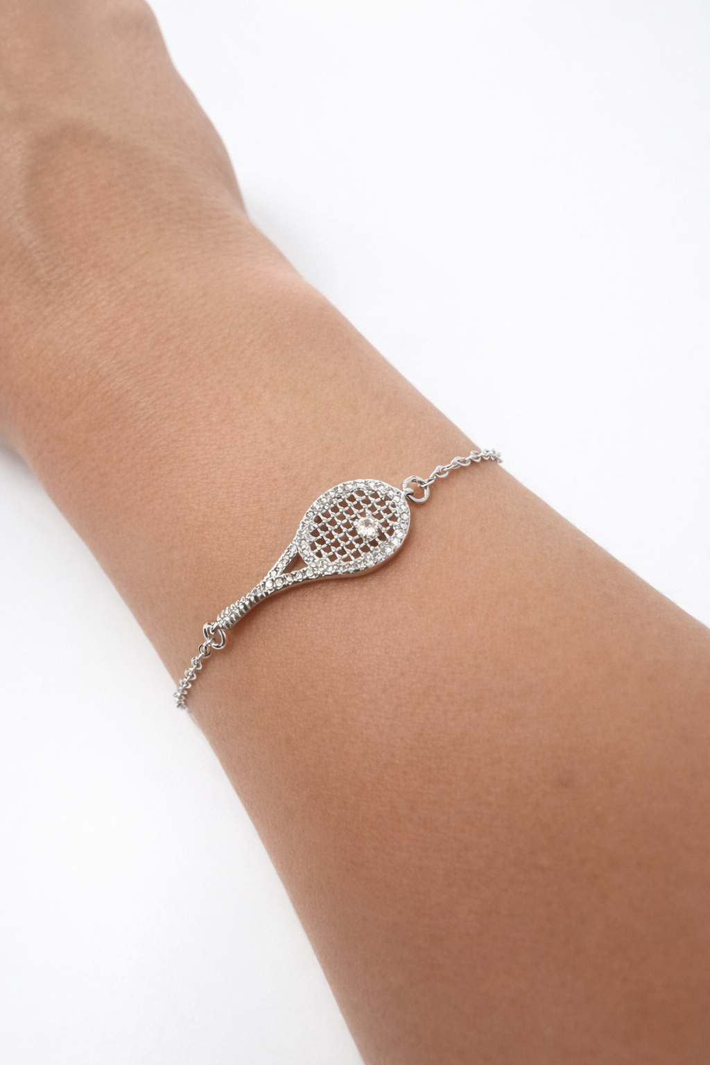 Pulseira Raquete, com detalhes em micro cravação de zirconias brancas, confeccionado em Banho de Ródio Branco .